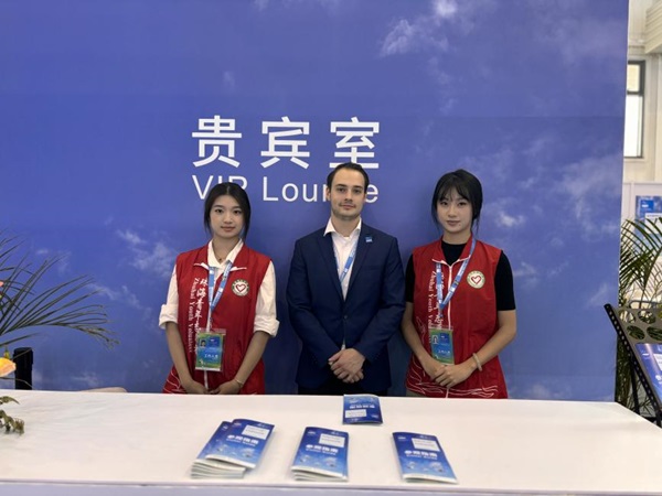 展会期间,志愿者们每天清晨六点集结出发,奔赴外宾接待、现场宣传、调查问卷、咨询引导、媒体服务等多个岗位。在展区,他们凭借流利的英语口语,为外国展商提供路线指引、现场翻译等服务,协助解决跨语言沟通难题;在咨询服务台,他们耐心解答中外观众关于展会安排、参展政策的疑问,累计提供咨询服务超3000人次;在论坛现场,他们精准传递会议信息,保障国际交流顺畅高效。来自24旅游英语专业的黄同学表示:“这次实践让我真切感受到专业知识的应用价值,面对不同国家的参展商,从紧张到从容,跨文化沟通能力得到了很大提升。”我校英语学子们的专业表现赢得广泛赞誉,德国Flying Pages参展商代表称赞道:“黄同学的英语表达专业流畅,服务细致周到,为我们搭建了高效的沟通桥梁。”展会期间,我校数字经济与技术(产业)学院(经济管理学院)实践副院长侯小军、学工副院长李小宁、应用外语系主任梁宏利、专任教师刘璐等前往现场走访指导,详细了解学子们的工作情况,对他们在高强度工作中展现的责任担当和专业素养给予高度肯定。